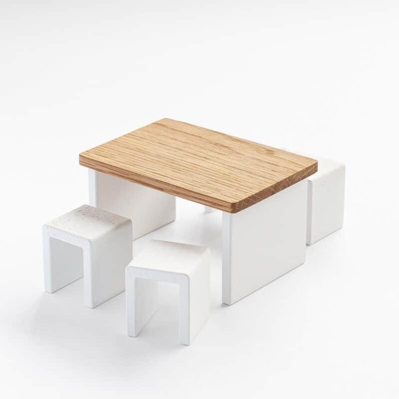 Miniature furniture made from solid oak and ash — the same wood as our dollhouses. Magnetic pieces attach directly to the wall without tools. Each item is sold separately so you can build exactly the interior you want.
