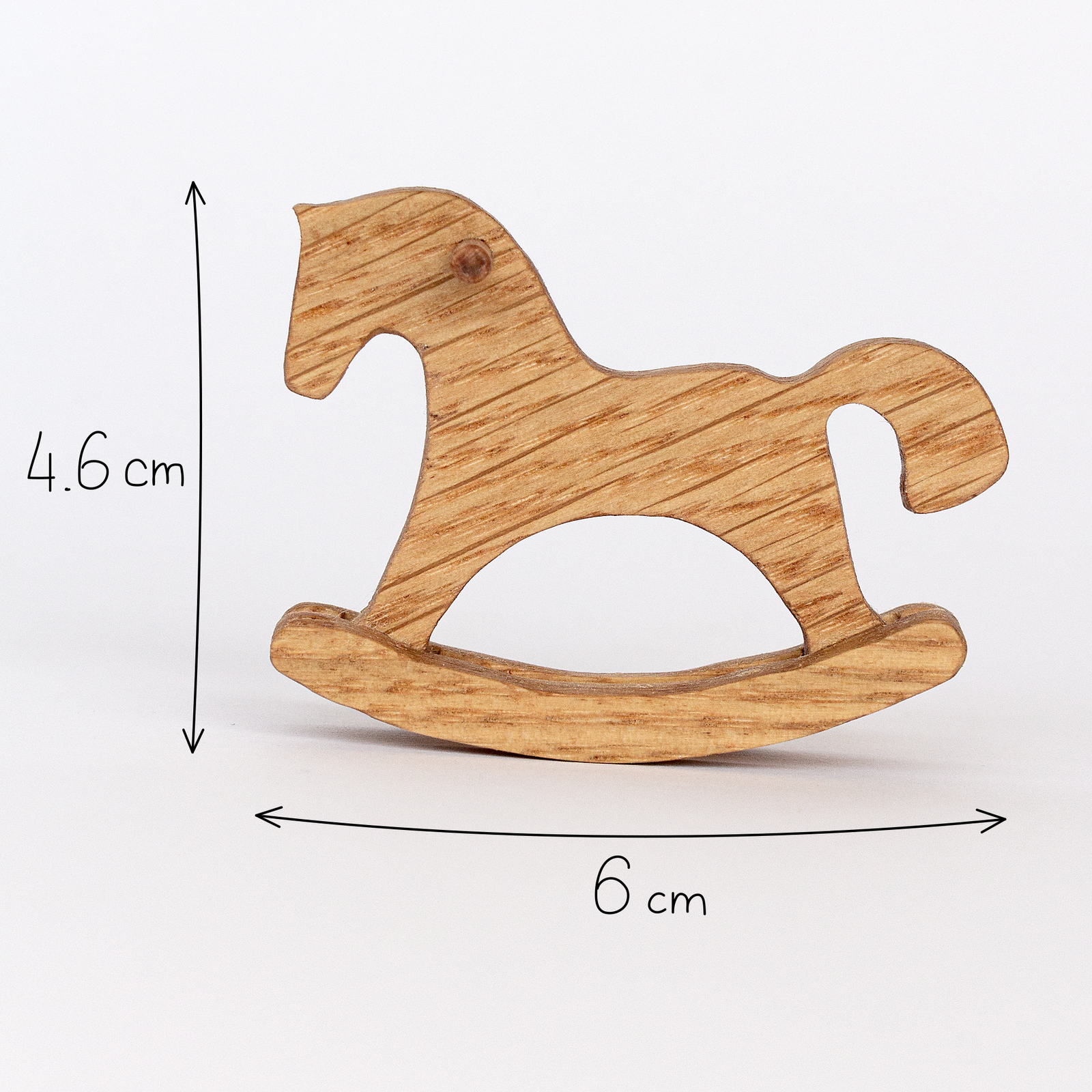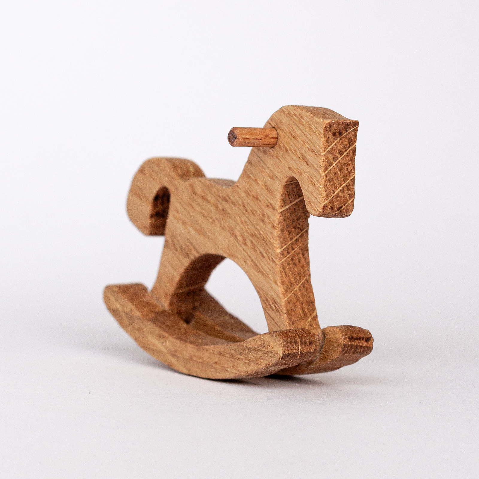 A miniature wooden rocking horse crafted from solid oak. Shaped, sanded and finished by hand — the horse actually rocks on its skids. Natural oil finish, no paint, no plastic. True 1:12 scale for Barbie Chelsea, Sylvanian Families and similar dollhouses. Made to order in our family workshop