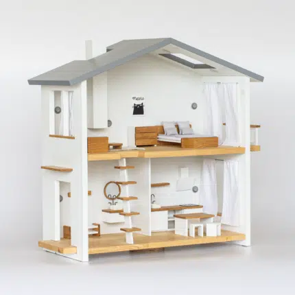 The dollhouse is delivered unassembled in a flat pack. You will have a detailed video tutorial on how to assemble the dollhouse. The dollhouse’s assembling is interesting and not difficult, like IKEA’s products.