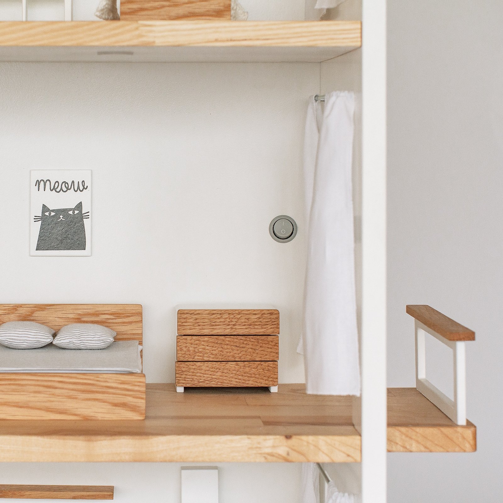 Katin Domik dollhouse bedroom and kitchen interiors with full furniture sets – natural wood and muted Scandinavian tones