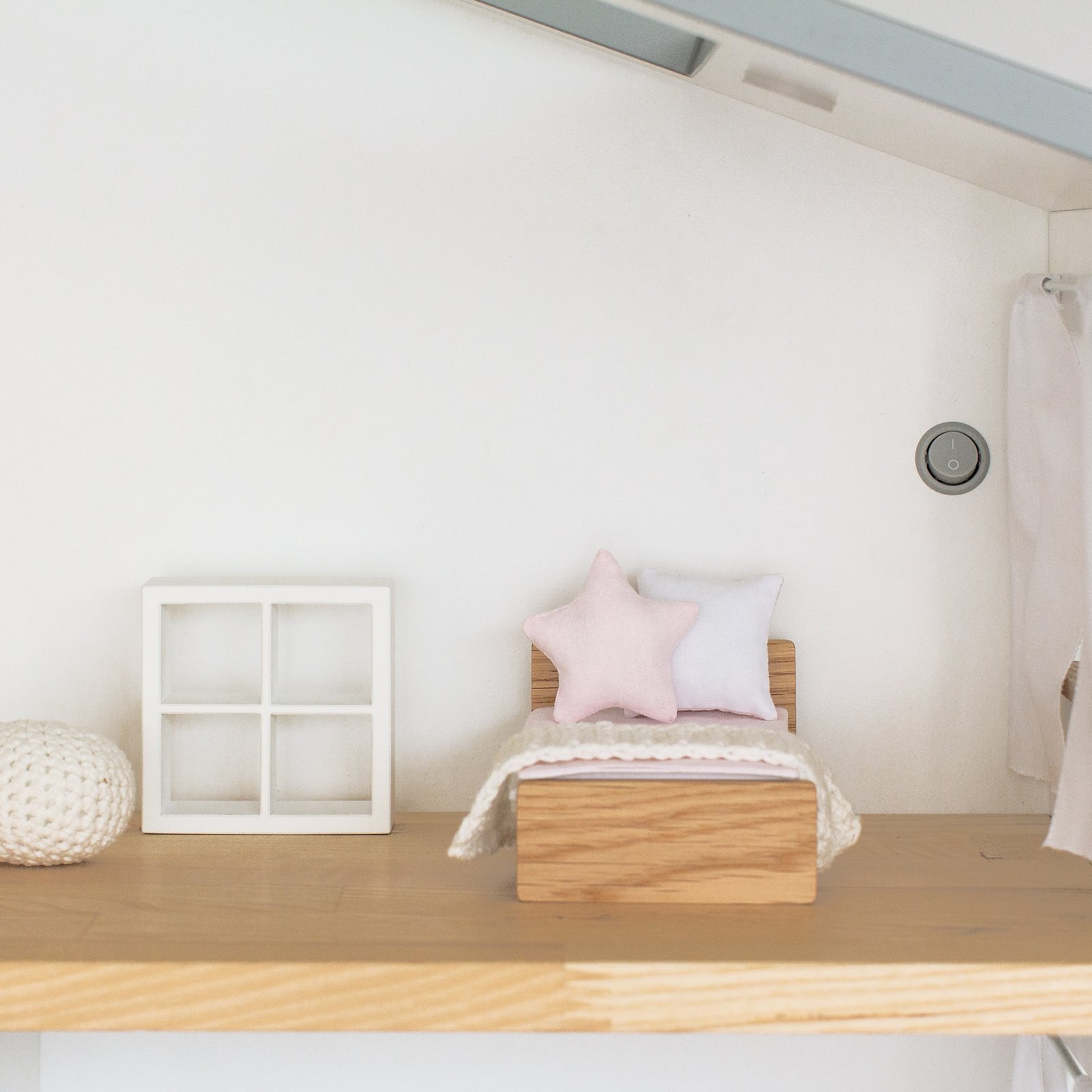 Dollhouse kids room furniture: bed with star pillow, wooden KALLAX-style rack, hand-knitted pouf and blanket