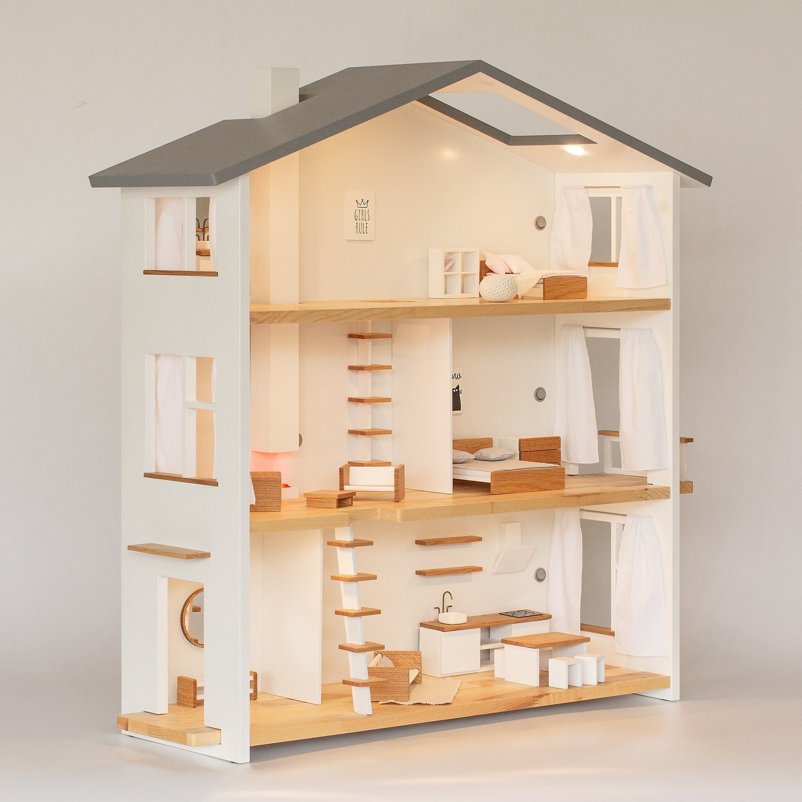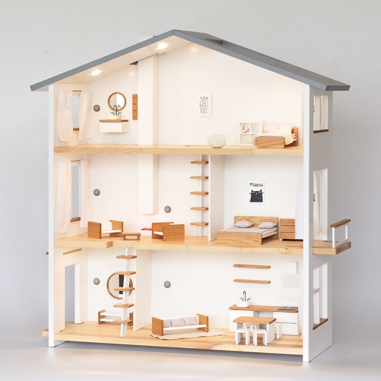 Modern 2-storey wooden dollhouse with lights, magnetic wall and furniture. 1:12 scale