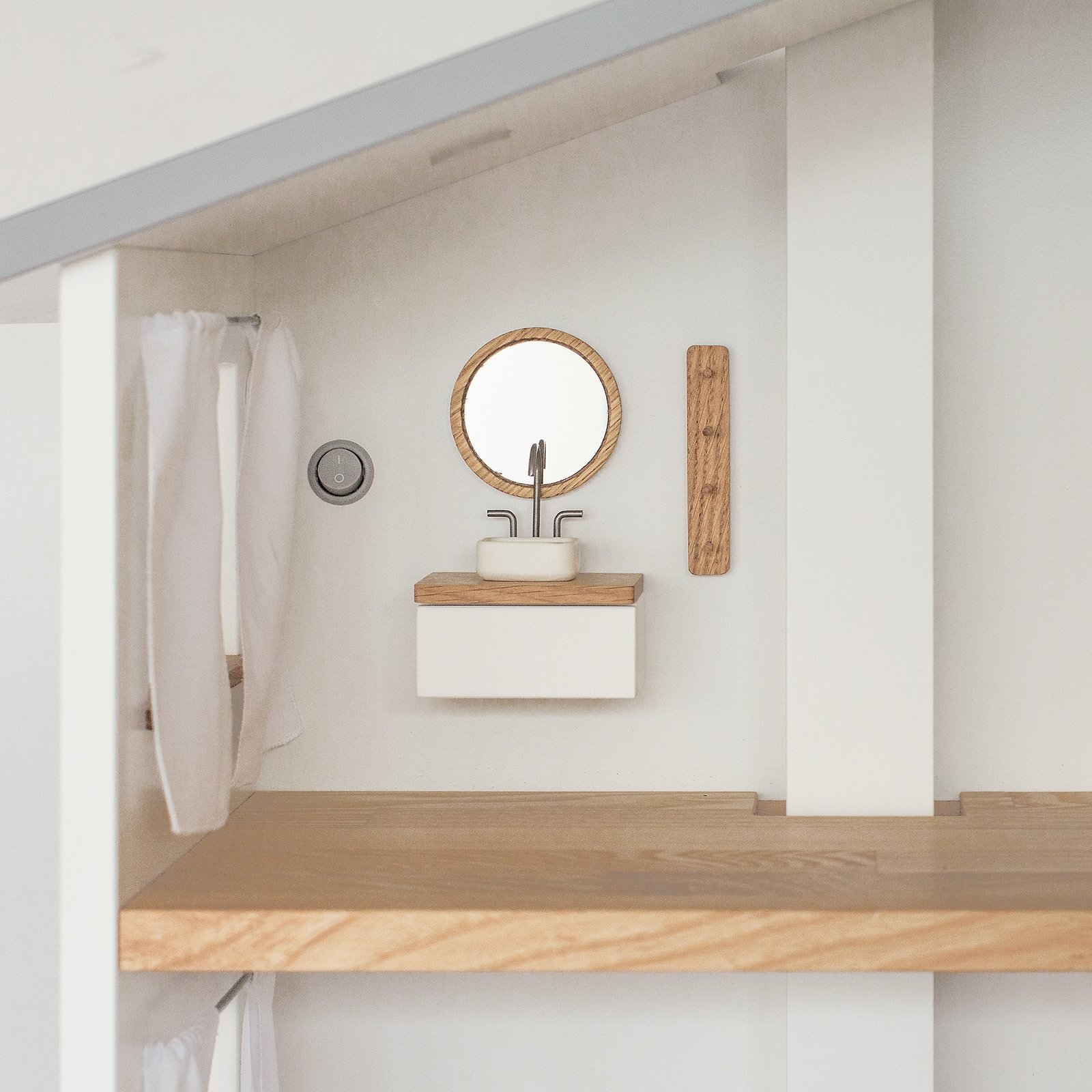 Katin Domik dollhouse bathroom furniture: floating vanity with sink and tap, minimalist towel rack, wooden-frame mirror