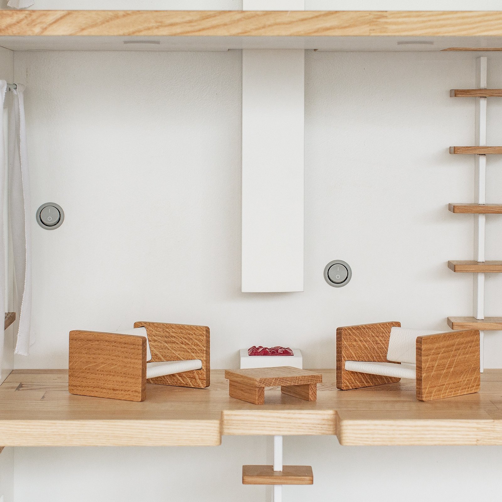 Katin Domik dollhouse living room furniture: two armchairs, coffee table, minimalist fireplace and linen curtains