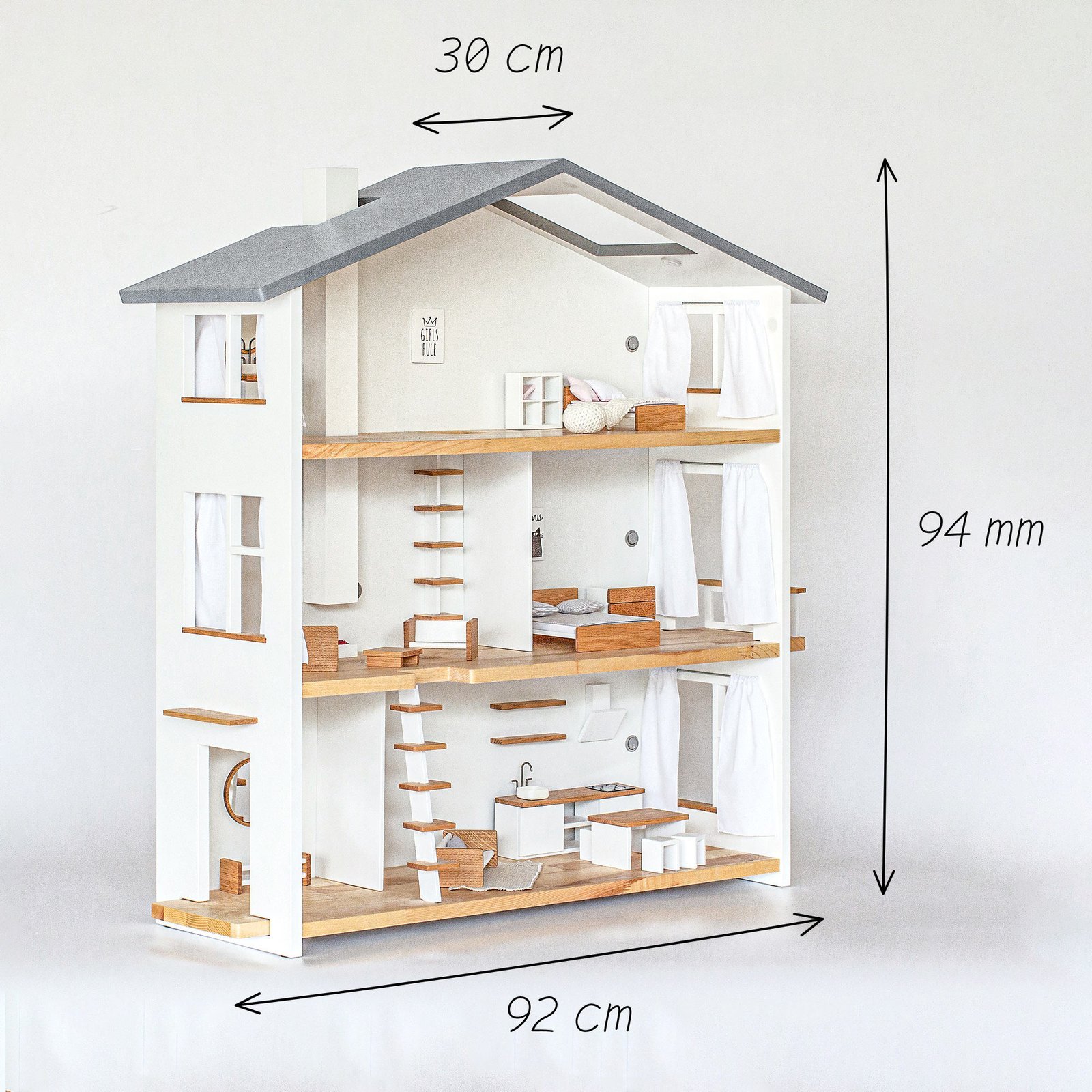 Three-story wooden dollhouse dimensions in centimetres with furniture – 92×30×94 cm, 1:12 scale